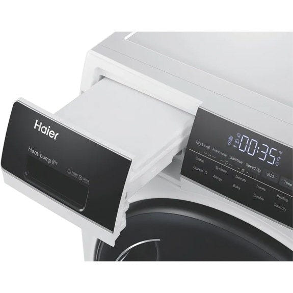 As an energy-efficient dryer with an 8-Star rating, the 8kg Heat Pump Dryer by Haier is ideal for families and large households. With 12 specialised and unique dry cycles, you can tailor your drying exactly how you need it for optimal results. With no outside ventilation needed, the heat pump technology dries clothing effectively at a lower temperature keeping gentle on delicate fabric and clothing. This Heat Pump Dryer also has the added benefit of a sanitise dry option using a higher temperature to kill more than 99.99% of bacteria.