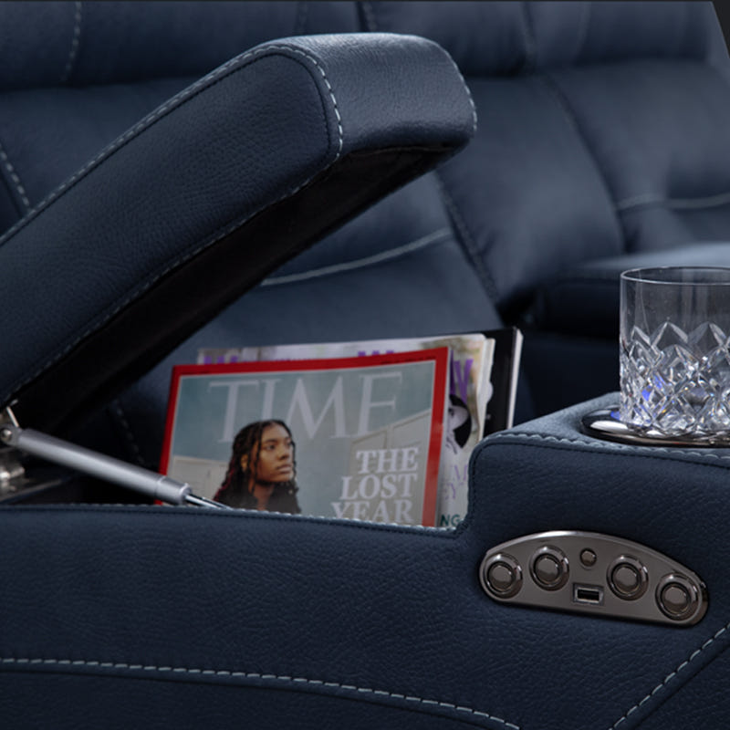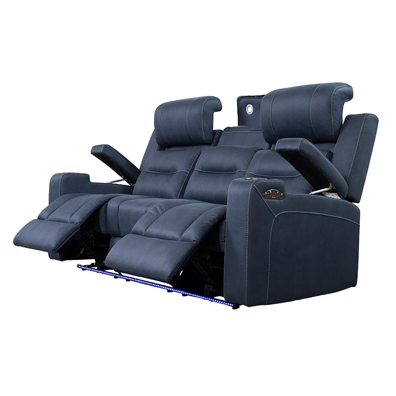 Unwind in style with the Spielberg 3 Seater Electric Fabric Recliner Sofa in Azure. Upholstered in luxurious Antelope Azure Fabric, this sofa features two electric reclining seats and adjustable headrests for ultimate comfort. The armrest storage, LED cup holders, and color-changing strip lighting add a touch of modern convenience. The middle seat backrest folds down to reveal an entertainment console, complete with a tray table and recessed cup holders. Stay connected with USB charging ports, power plugs, and LED reading lights. The support system includes webbing and zig-zag springs, with back cushion filling of fiber and foam, and cushioning filled with Dacron and pocket springs. Backed by a 5-year structural warranty and a 2-year warranty on fabric and motor, this sofa measures 2020mm W x 970mm D x 1040mm H.