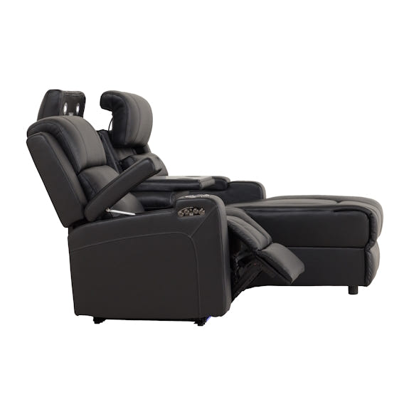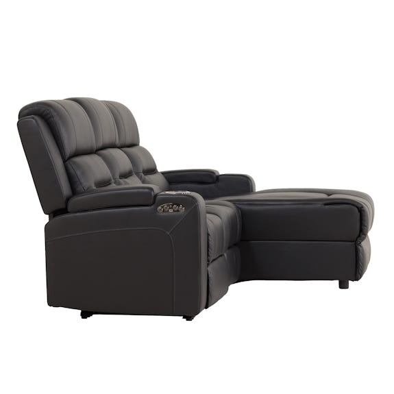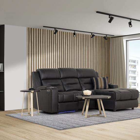 The new Spielberg 3-seater leather chaise redefines home theatre lounging with its impressive features. This stylish sofa includes two independent electric reclining seats controlled by a user-friendly touchpad. The fixed middle seat transforms into a modern hub with integrated cup holders, tray table, reading lights, power plugs, and charging ports. The electric end seat allows easy elevation and leg extension, with adjustable headrest for personalized comfort. Additional features include ambient strip lighting, hidden armrest storage, and USB ports for mobile device charging. Available in left or right-hand chaise options, the black leather finish exudes a premium look. Alternately, choose from fabric finishes in Ash, Jet, or Blue Azure, all equipped with the same modern conveniences.
